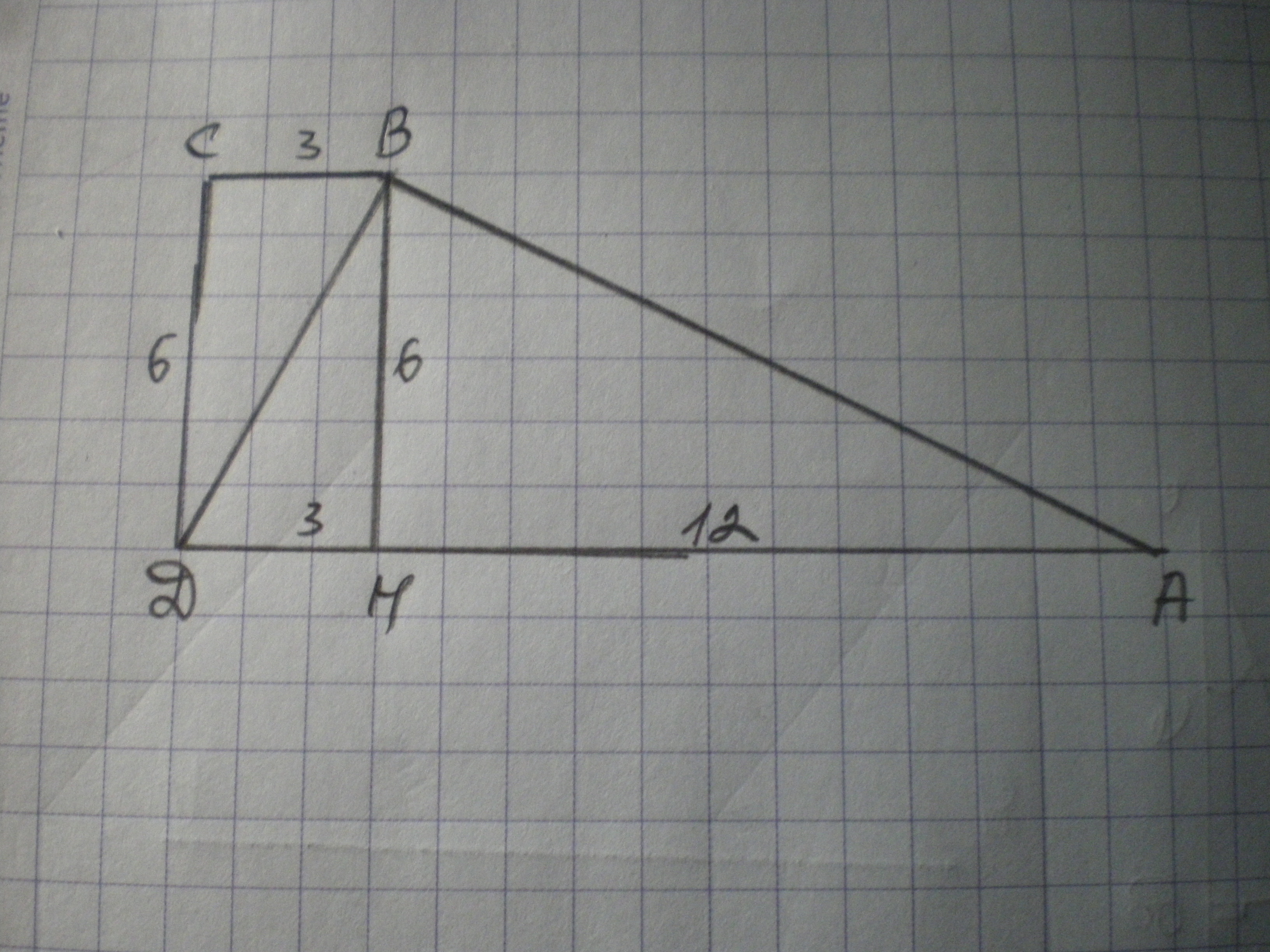 Проведем высоту ВН=СД=6. Рассмотрим ΔАВД -прямоугольный. По свойству высоты, проведенной к гипотенузе, ВН²=ДН*АН, откуда ДН*АН=36; 3АН=36; АН=12.
