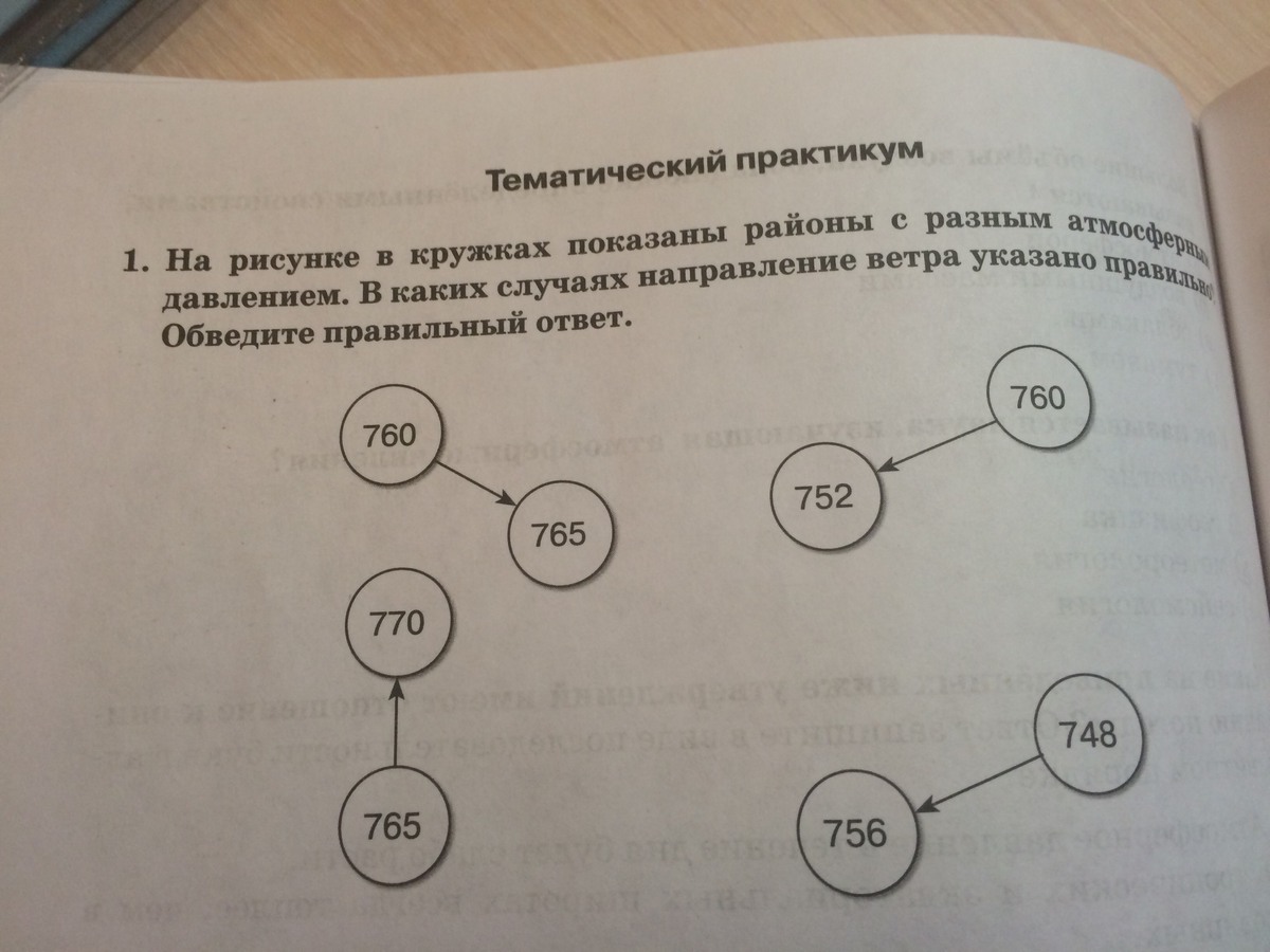 На рисунке в кружках показаны районы с разным атмосферным давлением . В каких случаях направление ветра указано правильно?
