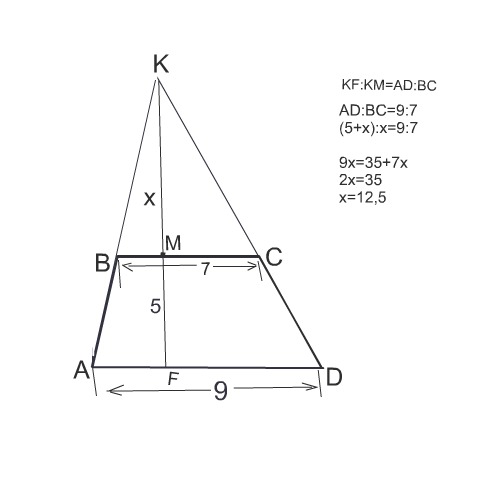 Основания BC и AD трапеции ABCD равны 7 и 9 соответственно. Боковые стороны продолжены до пересечения в точке К. Найдите высоту KF треугольника ADK если высота трапеции 5