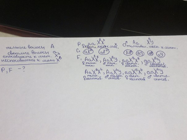 Светлые волосы - признак аутосомный рецессивный, а способность к математике определяется другим рецессивным геном, сцепленным с полом. Темноволосый мужчина, неспособный к математике, женился на световолосой девушке, у которой в школе по математике было много двоек. Оба гетерозиготы, но мужские гаметы с доминантным аутосомным геном оказались почему то неспособными к оплодотворению. Определить генотипы родителей и каким будет первое поколение