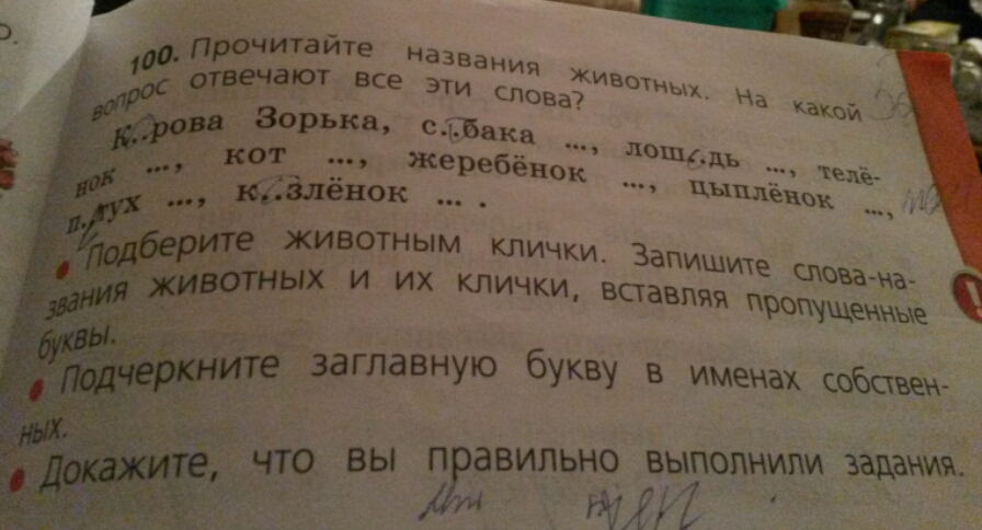 Слова, называющие родовые наименования животных (имена существительные нарицательные), отвечают на вопрос (кто?): корова, собака, лошадь, теленок, кот, жеребенок, цыпленок, петух, козленок.