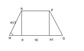 В ровнобедренной трапеции MNPQ основание равно 16 см боковая сторона равна 4корень из 3 и угол M равен 30градусов .Найти площадь трапеции