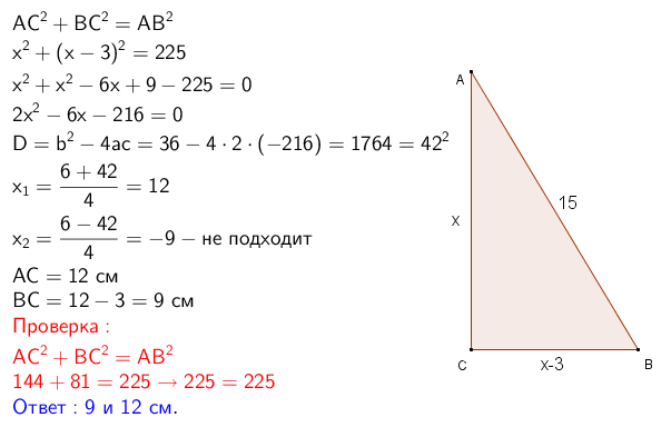 гипотенуза пряMоугольного треугольника равно 15 сM а один из катетов на 3 сM Mеньше другого .найдите катеты треугольника