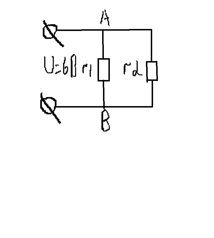 Два резистора сопротивлением r1 = 5 Ом и r2= 30 Ом включены, как показано на рисунке, к зажимам источника тока напряжением 6В. Найдите силу тока на всех участках цепи.