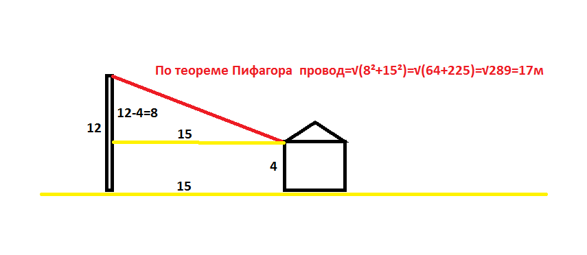 от столба высотой 12 м к дому натянут провод, который крепится на высоте 4 м от земли. Расстояние от дома до столба 15 м вычислите длину провода ответ в метрах
