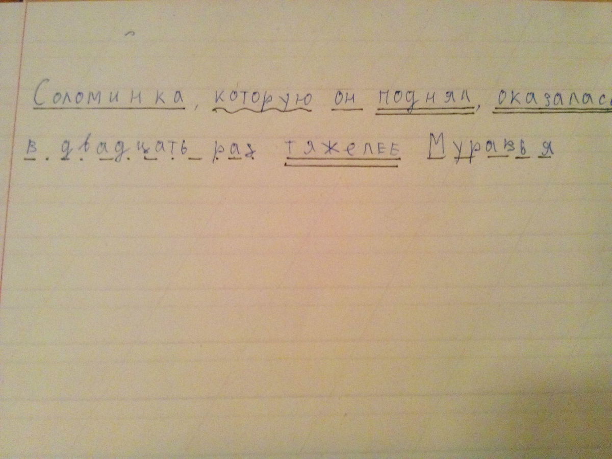 Соломинка-подчёркиваем одной чертой, он-одной чертой, поднял-двумя чертами, оказалась-двумя чертами, в двадцать раз-пунктиром, тяжелее- пунктиром с точкой, муравья-пунктиром.