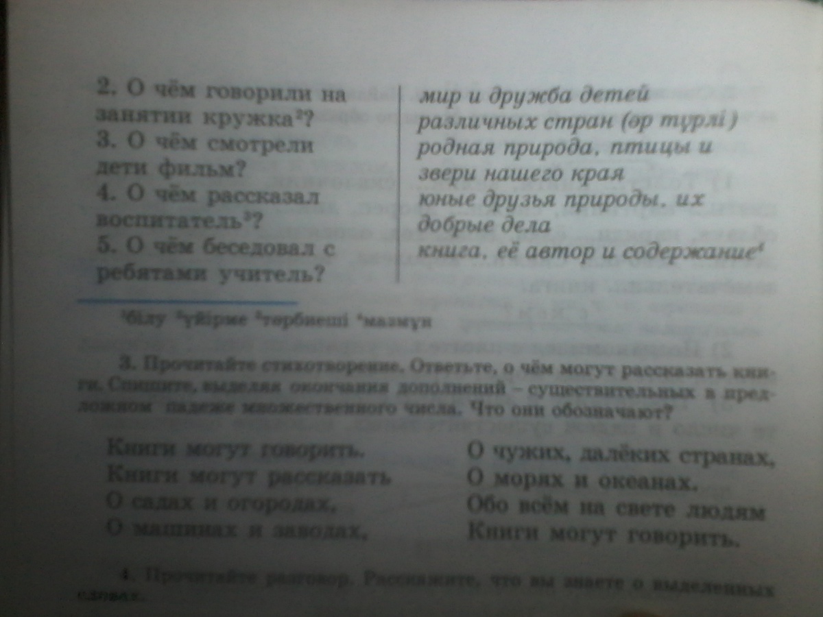 1. На уроке географии ребята узнали (узнали о чем?) о рекАХ, озёрАХ нашей республики. 2. На занятии кружка говорили (говорили о чем?) о мирЕ и дружбЕ (дружба кого?) детей различных стран. 3. Дети смотрели фильм (фильм о чем? или смотрели о чем?) о родной природЕ, птицАХ и зверЯХ нашего края. 4. Воспитатель рассказал (рассказал о чем?) о юных друзьЯХ (друзья чего?)природы и их добрых делАХ. 5. Учитель беседовал (беседовал с кем?) с ребятами (беседовал о чем?) о книгЕ, её авторЕ и содержанИИ.