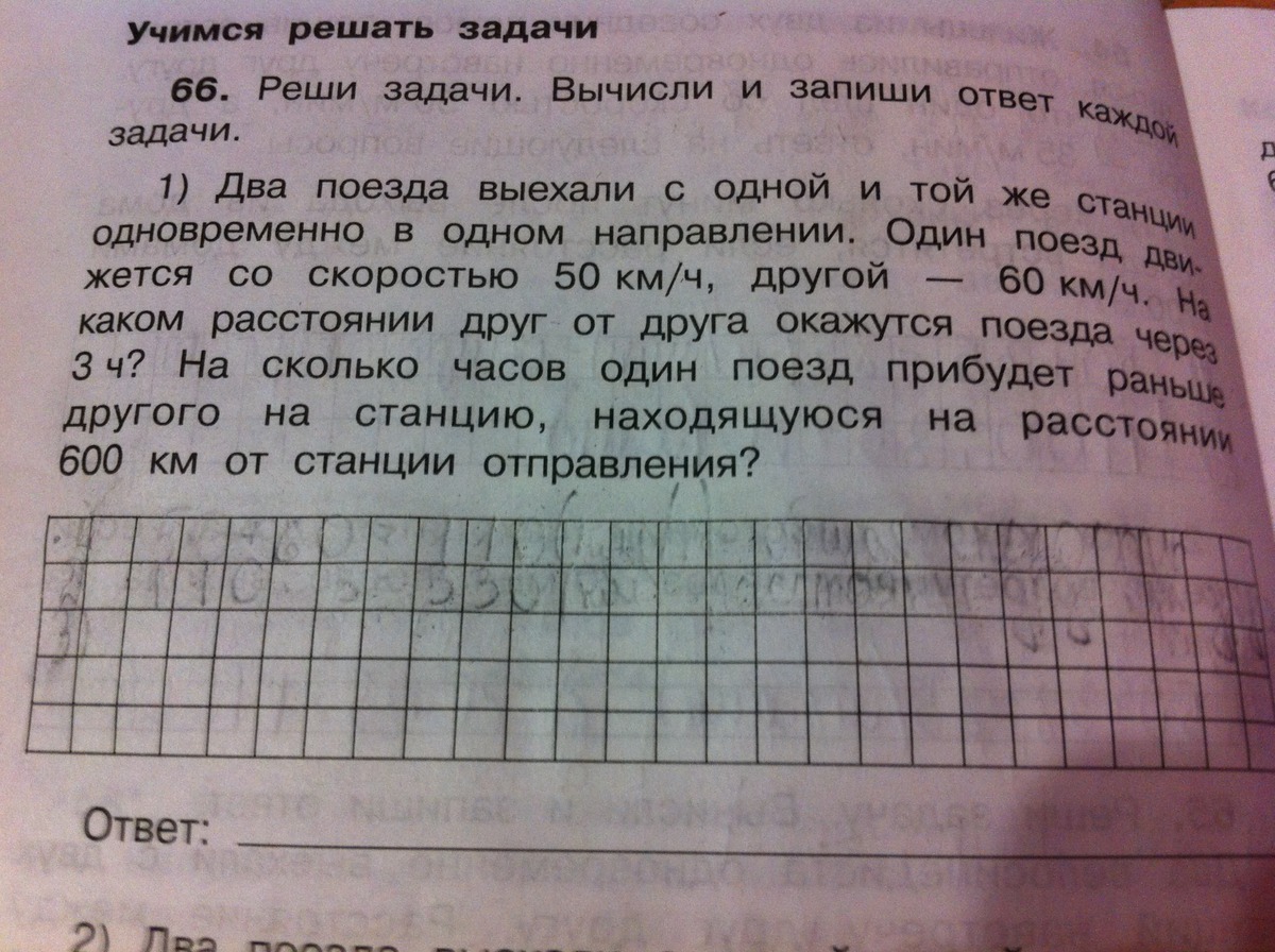 Два поезда выехали с одной и той же станции одновременно в одном направлении.Один поезд движется со скоростью 50 км/ч, другой -- 60 км/ч. На каком расстоянии друг от друга окажутся поезда через 3 ч? На сколько часов один поезд прибудет раньше другого на станцию, находящуюся на расстоянии 600 км отправления?