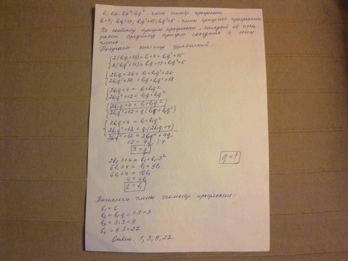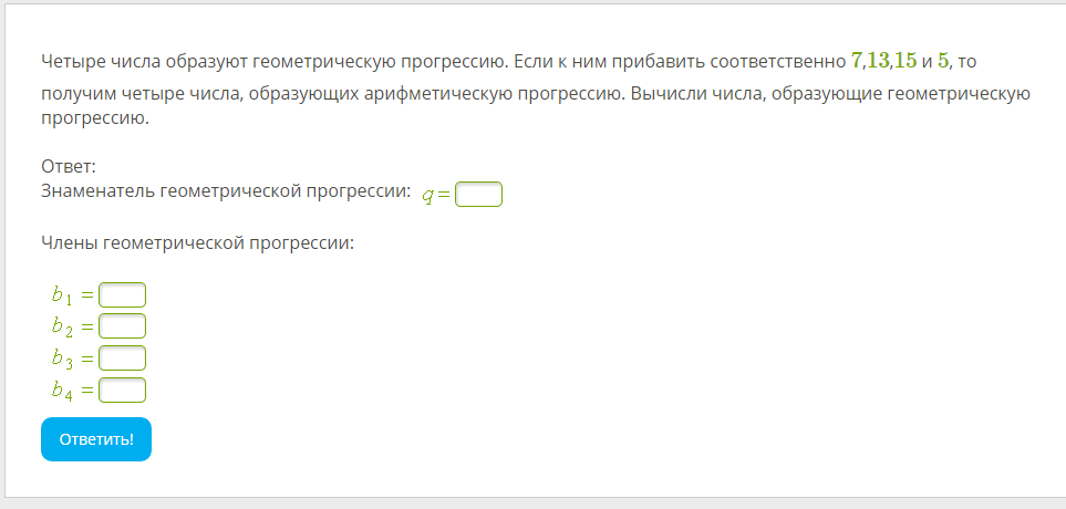 Четыре числа образуют геометрическую прогрессию. Если к ним прибавить соответственно 7,13,15 и 5, то получим четыре числа, образующих арифметическую прогрессию. Вычисли числа, образующие геометрическую прогрессию.