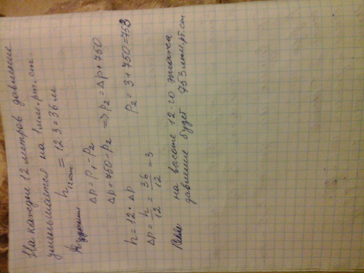 определите величину атмосферного давления на высоте 12-го этажа(высота каждого этажа 3 м),если на поверхности земли давление 750 мм рт. ст.