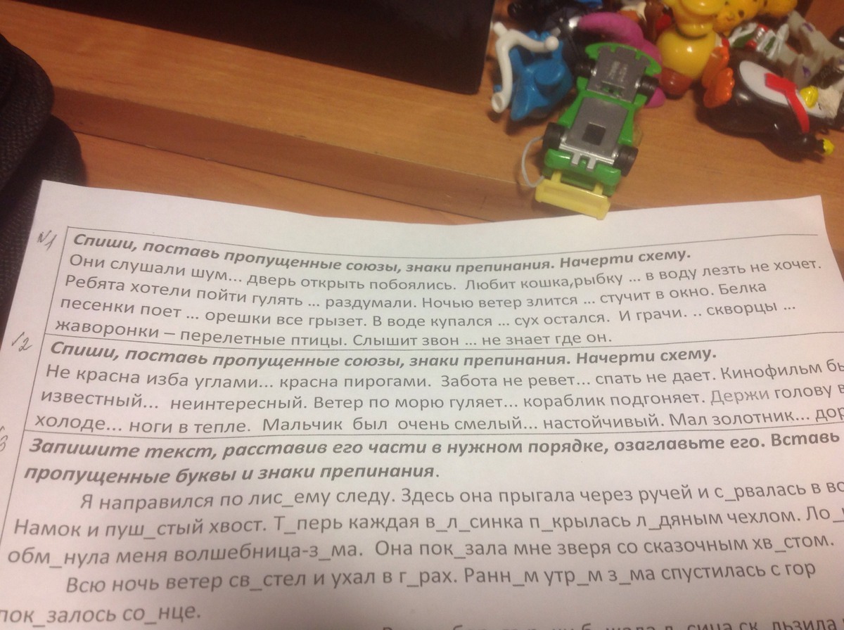 Они слушали шум, но дверь открыть побоялись. Любит кошка рыбку, а в воду лезть не хочет. Ребята хотели пойти гулять, но раздумали. Ночью ветер злиться и стучит в окно. Белка песенки поёт да орешки всё грызёт. В воде купался да сух остался. И грачи, и скворцы, и жаворонки - перелётные птицы. Слышит звон, но не знает где он.