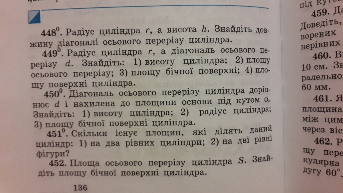 1. диагональ осевого сечения (гипотенуза), высота (катет) и диаметр основания образуют прямоугольный треугольник.