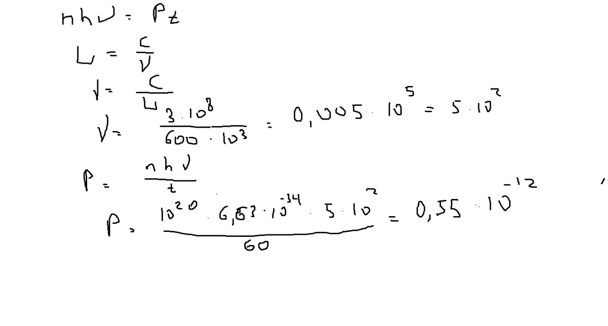 длина волны лазерного излучения равна 600 км. Какова мощность излучения лазаря ,если он излучает 10^20 фотонов в минуту