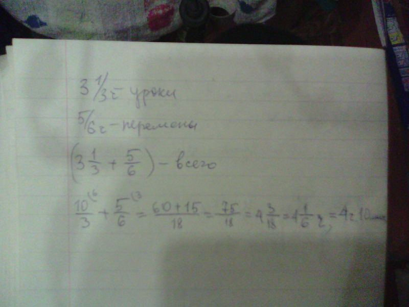 В среду уроки в 5 классе длились три целых и одну третью часа ,а перемены пять шестых часа.Сколько времени пятиклассники находились в школе?Выразите ответ сначала в часах ,а затем в часах и минутах