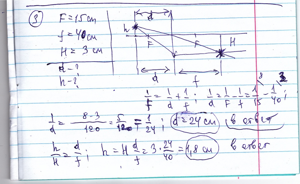 3.Фокусное расстояние тонкой собирающей линзы F=15 см. Где расположен точечный источник света, если его действительное изображение получается на экране на расстоянии f=40 см от линзы и удалено на Н=3,0 см от ее главной оптической оси?