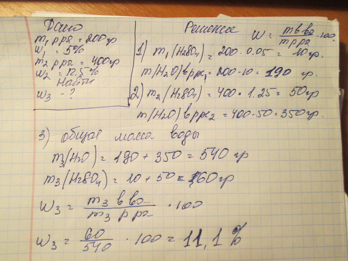 2) Смешали 200 г 5% раствора и 400 г 12,5% раствора серной кислоты .Определите массовую долю полученную в растворе.