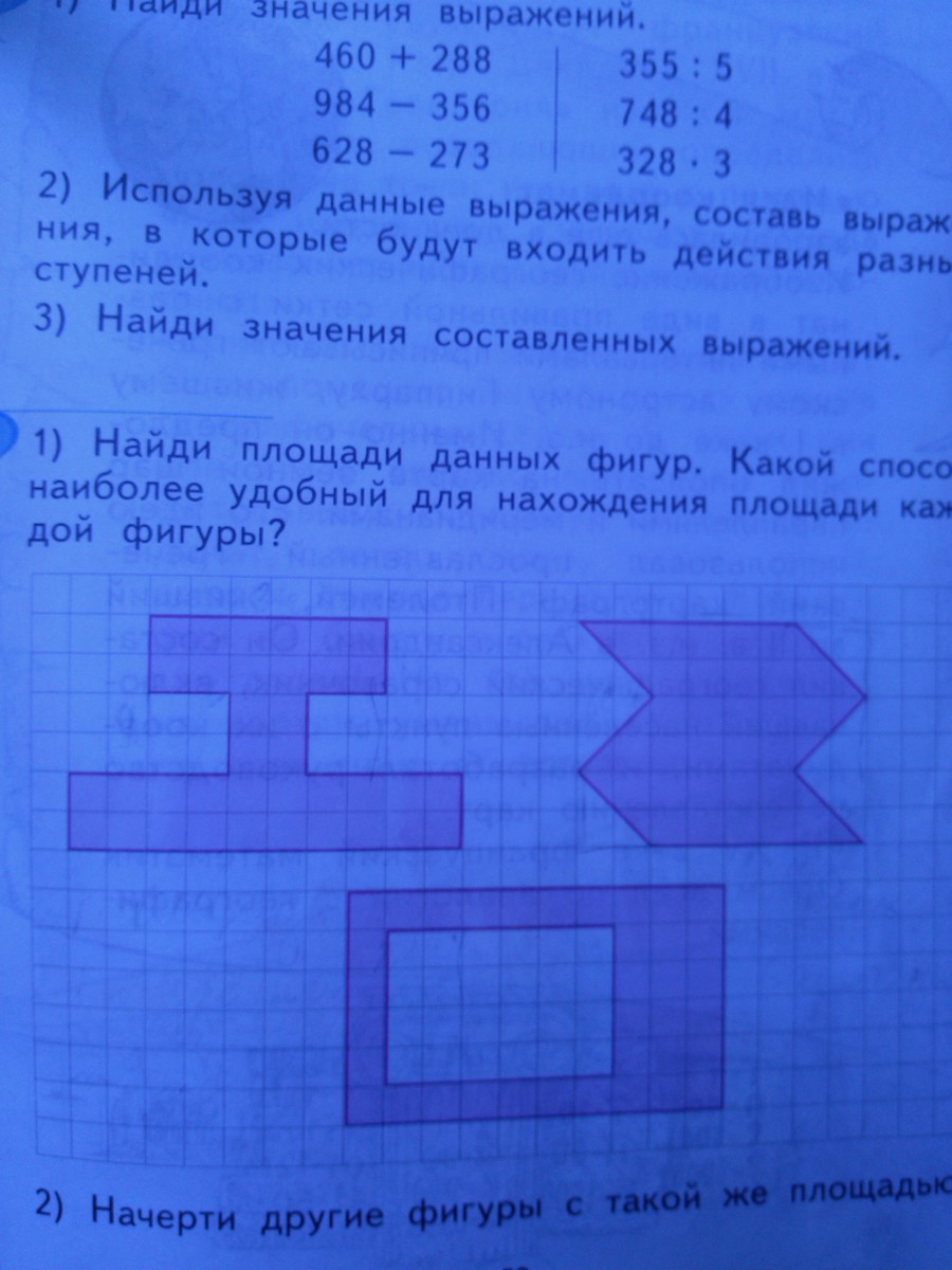 Найди площади данных фигур.Какой способ наиболее удобный для нахождения площади каждой фигуры?