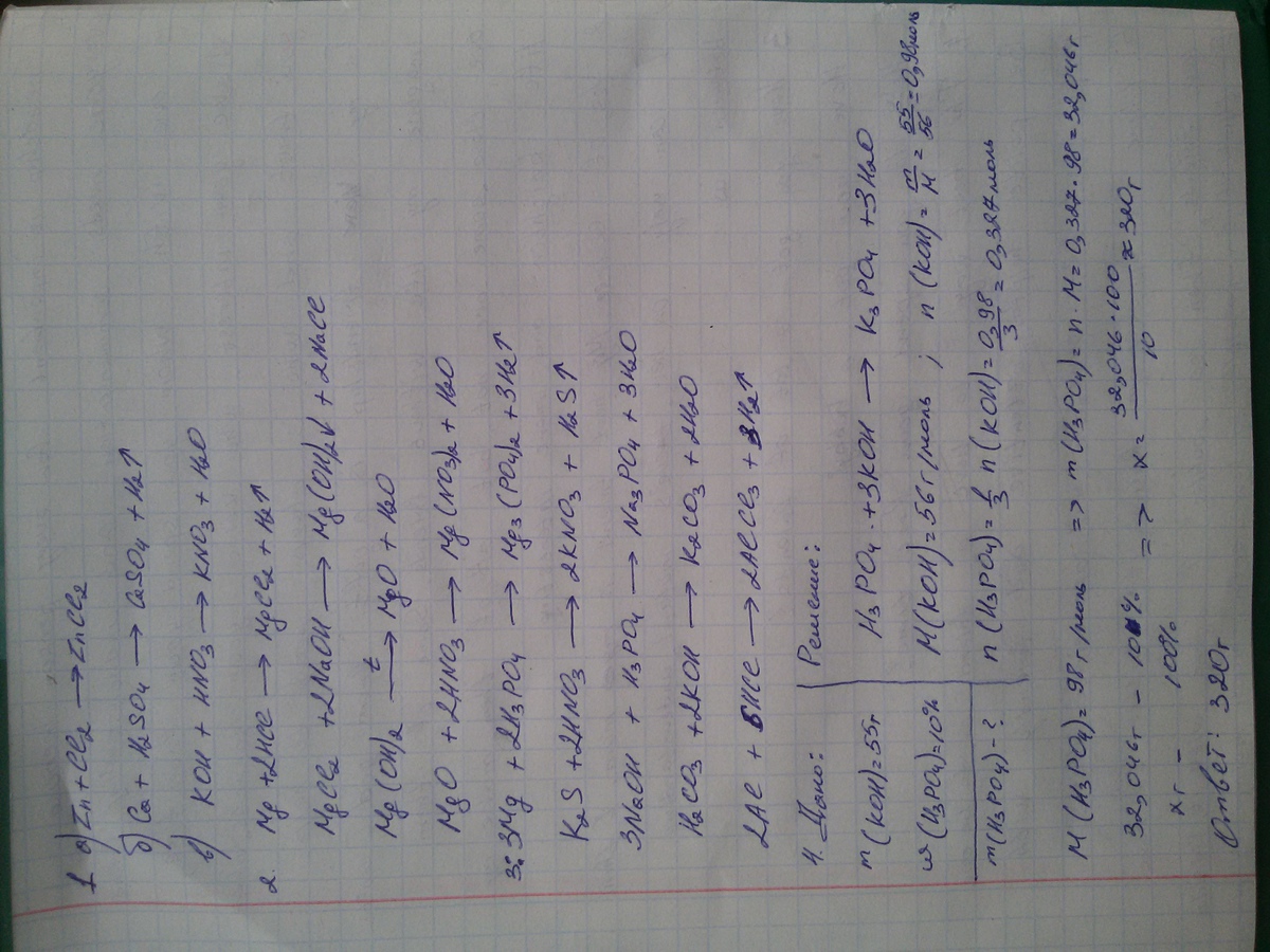 3.Запишите уравнения возможных реакций: магний+фосфорная кислота=?; сульфид калия+азотная кислота=?, гидроксид натрия+фосфорная кислота=?, угольная кислота+гидроксид калия=?, алюминий+соляная кислота=?