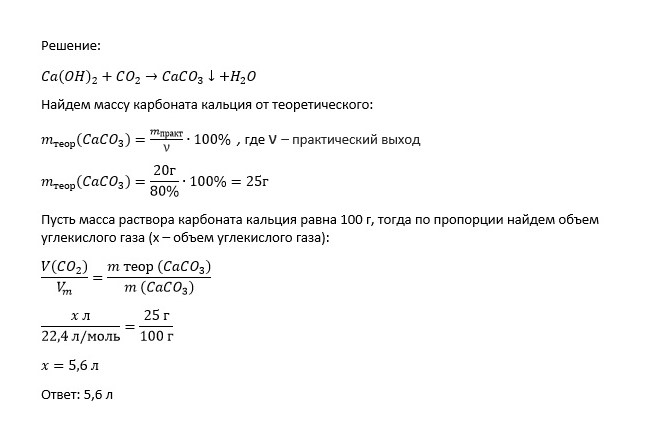какой объем углекислого газа пропустили через известковую воду если при этом выпало 20г осадка что составляет 80% от теоретически возможного