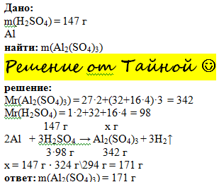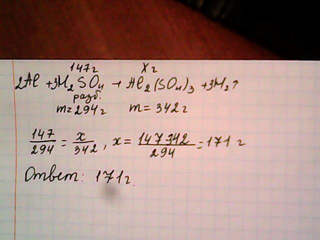 ЗАВТРА СДАВАТЬ А Я НЕ ЗНААААААААЮ! 2 задача : Алюминий растворили в серной кислоте массой 147 г . Сколько грамм сульфата алюминия образовалось при этом