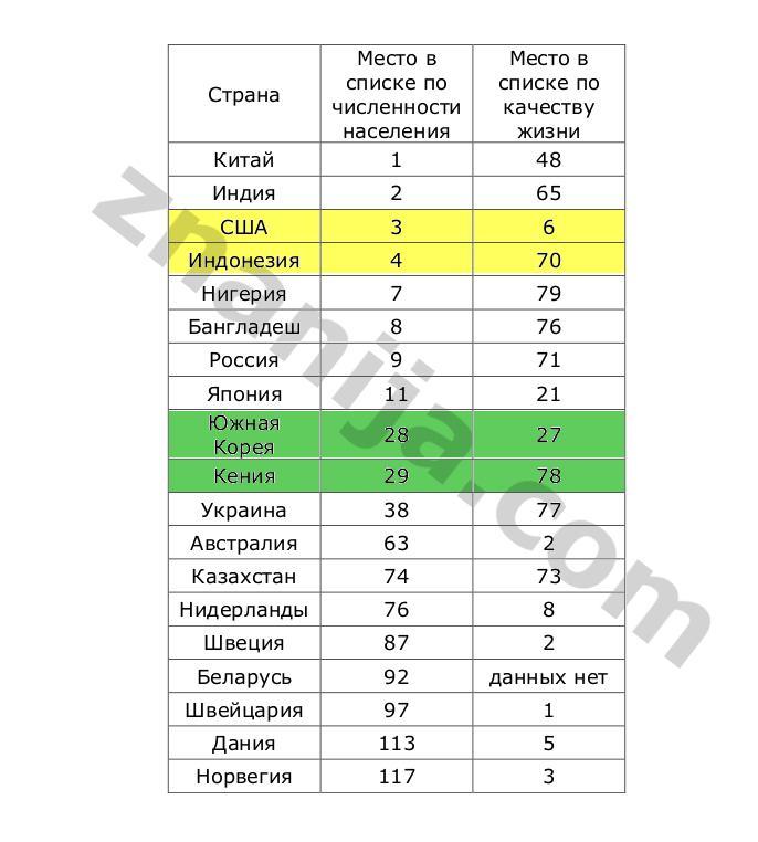 Из таблицы, прикрепленной к ответу, можно увидеть, то, о чем я писала выше, что численность населения не влияет на качество жизни. Яркими примерами могут быть пары: США и Индонезия, Южная Корея и Кения - разница в численности населения сравнительно незначительная, ну а в качестве жизни вы все видите сами в таблице.