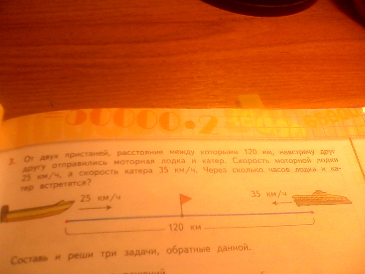 От двух пристаней расстояние между которыми 120 км навстречу друг другу отправились моторная лодка и катер скорость моторной лодке 25 километров в час а скорость катера 35 километров в час через сколько часов лодка и катер встретятся