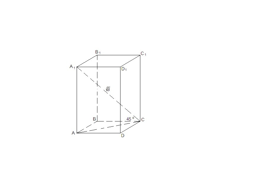 Одна из граней прямоугольного параллелепипеда - квадрат.Диагональ параллелепипеда равно корень из 8 и образует с плоскостью этой грани угол в 45 градусов .Найдите объём параллелепипеда . Очень нужно срочно