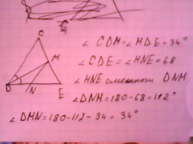 отрезок DM бессиктриса треугольника CDE.через точку M проведена прямая,параллейна стороне CD и пересекающая сторону DE в точке N.найдите углы треугольникаDMN,если уголCDE равен 68 градусов