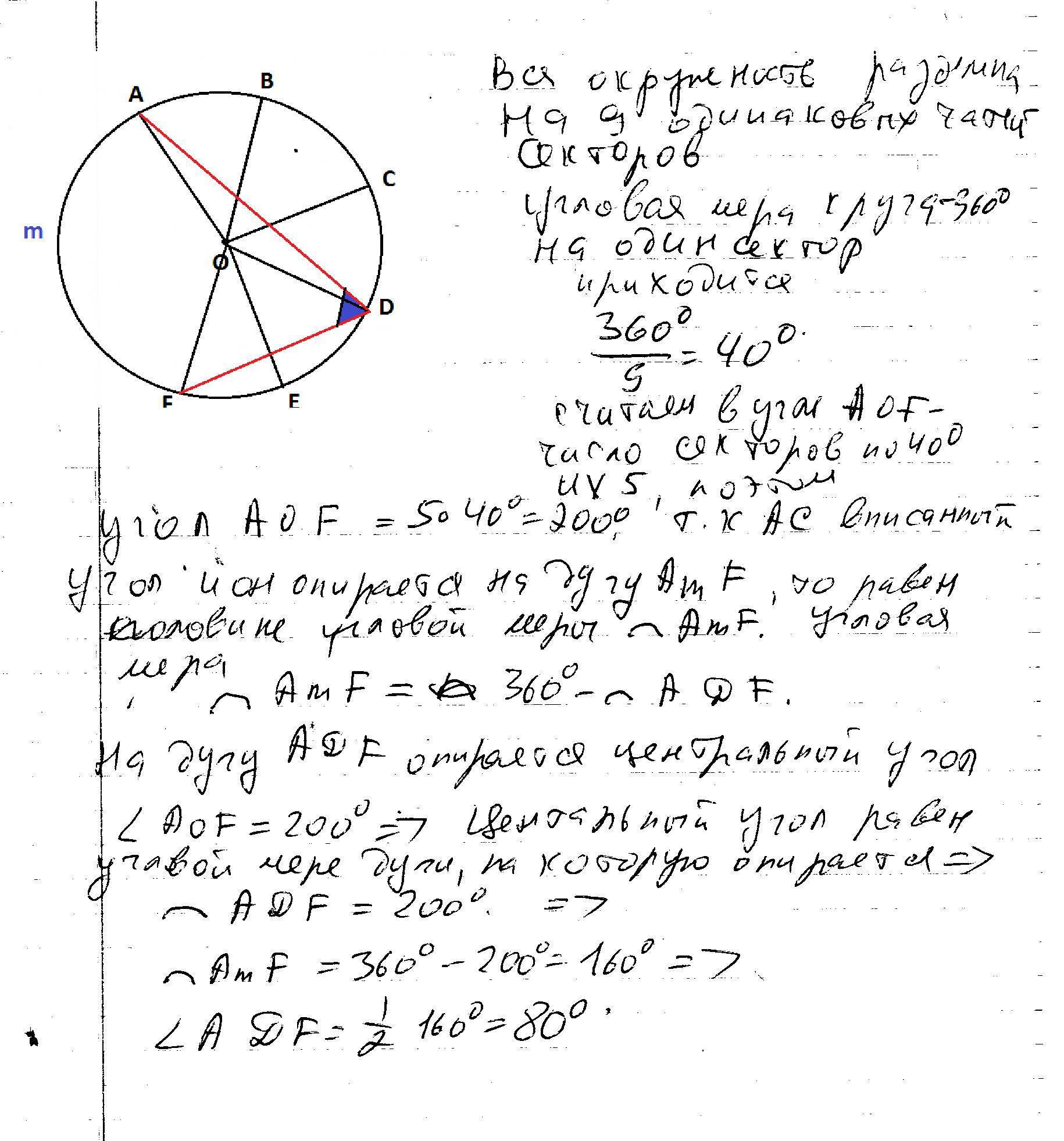 На окружности взяты последовательно девять точек: А, В, С, D, E, F, G, H,K, которые делят окружность на равные части. найдите градусную меру угла АDF