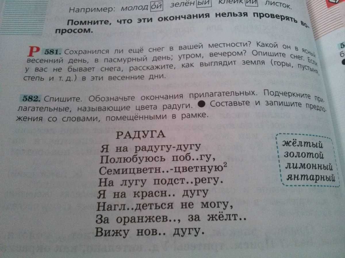 !!!!! Спишите обозначьте окончания прилагательных подчеркните прилагательные называющие цвета радуги. Составьте и запишите предложения со словами в рамочке. ПРОШУ ПОМОГИТЕ МНЕ ОЧЕНЬ СРОЧНО НУЖНО ЭТО СДЕЛАТЬ !!!!!!!!!!