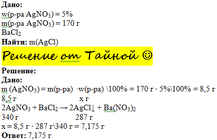 Какая масса соли выпадет в осадок при взаимодействии 170г 5%-ного раствора нитрата серебра с достаточным количеством раствора хлорида бария?