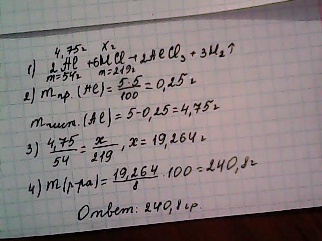 2) Найдите массу раствора соляной кислоты с массовой долей 8% которая потребуется для растворения смеси массой 5 г, которая содержит алюминий и 5% примесей.