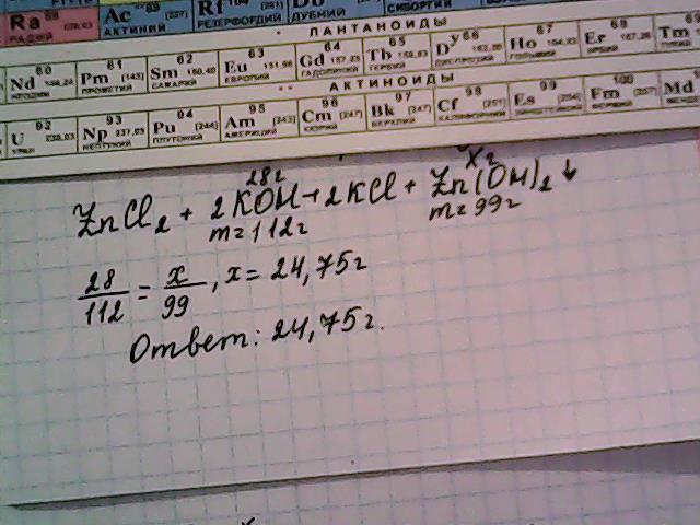 1)К раствору хлорида цинка прилили 28г гидроксида калия. Вычислите массу выпавшего осадка