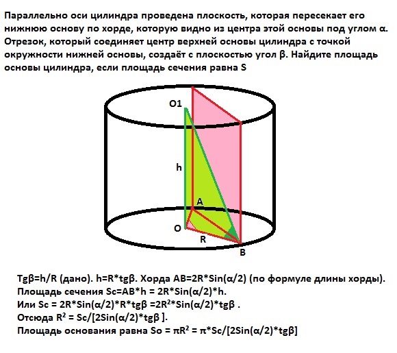 100 баллов! Параллельно оси цилиндра проведена плоскость, которая пересекает его нижнюю основу по хорде, которую видно из центра этой основы под углом α. Отрезок, который соединяет центр верхней основы цилиндра с точкой окружности нижней основы, создаёт с плоскостью угол β. Найдите площадь основы цилиндра, если площадь сечения равна S