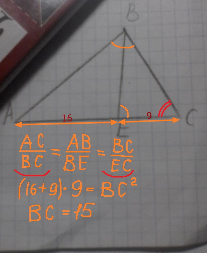 На рисунке 1 треугольник BEC подобен треугольнику ABC .AE =16, CE = 9 см углы ABC и BEC - тупые.Найти BC