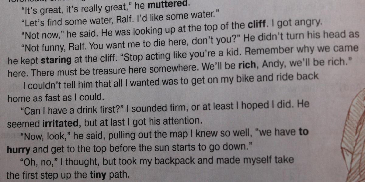 "Не смешно, Ральф. ты хочешь чтобы я умер здесь, не так ли?"Он не повернул своей головы,так как он продолжал смотреть на утес. "Прекрати строить из себя ребенка(прекрати играть в ребенка).Вспомни,зачем мы пришли сюда.Где-то здесь должны быть сокровища.Мы будем багатыми,Энди,мы будем багатыми!"