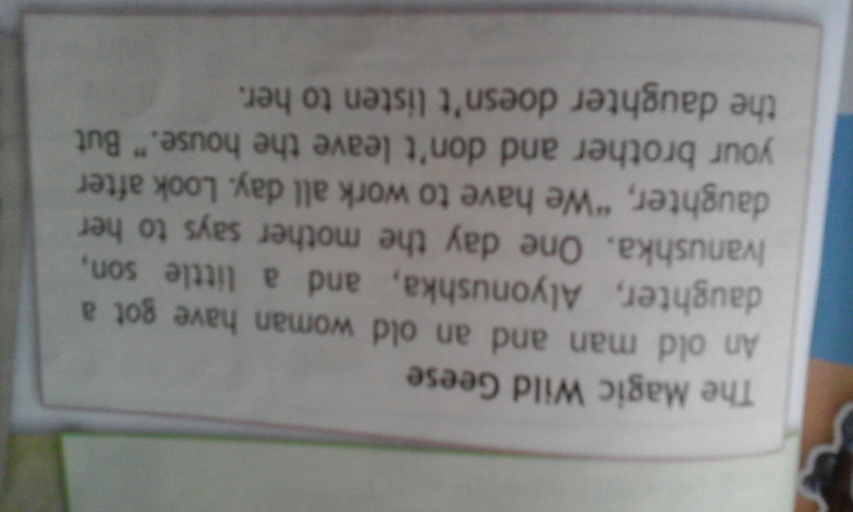 У старика(пожилого мужчины) и старухи(пожилой женщины) была дочь, Аленушка, и маленький сын, Иванушка.Однажды мать сказала дочери, "Мы работали весь день.Пригляди за своим братом ,и не покидайте дом." Но дочь не послушала её.
