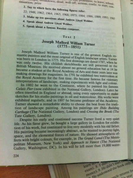 Джозеф Маллорд Уильям Тёрнер один из величайших английских романтических художников и самый оригинальный английский художник-пейзажист .Тёрнер родился в Лондоне в 1775 году.Его первая картина датирована 1787 годом , когда ему было всего лишь 20 лет . Его детскиий альбом до сих про хранится в Британском Музее. Он практически не получил общего образования но в 14 лет он стал студентом Королевской Академии Исскуств и тремя годами позже делал рисунки для журналов . В 1791 две его акварельных картины были впервые выставлены в Королевской Академии. Он стал знаменитым за фантастические интерпретации пейзажей , делая эксперименты над светом и цветами.