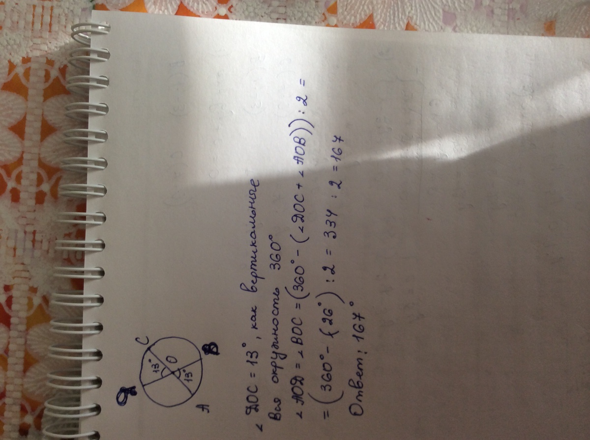AC и BD - диаметры окружности с центром О. Угол АСВ равен 13 градусов. Найдите угол АОD. Ответ дайте в градусах!