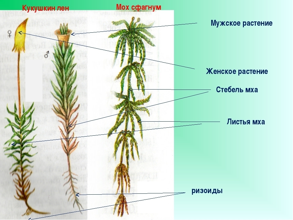 - У сфагнума нет ризоидов, у кукушкина льна есть.