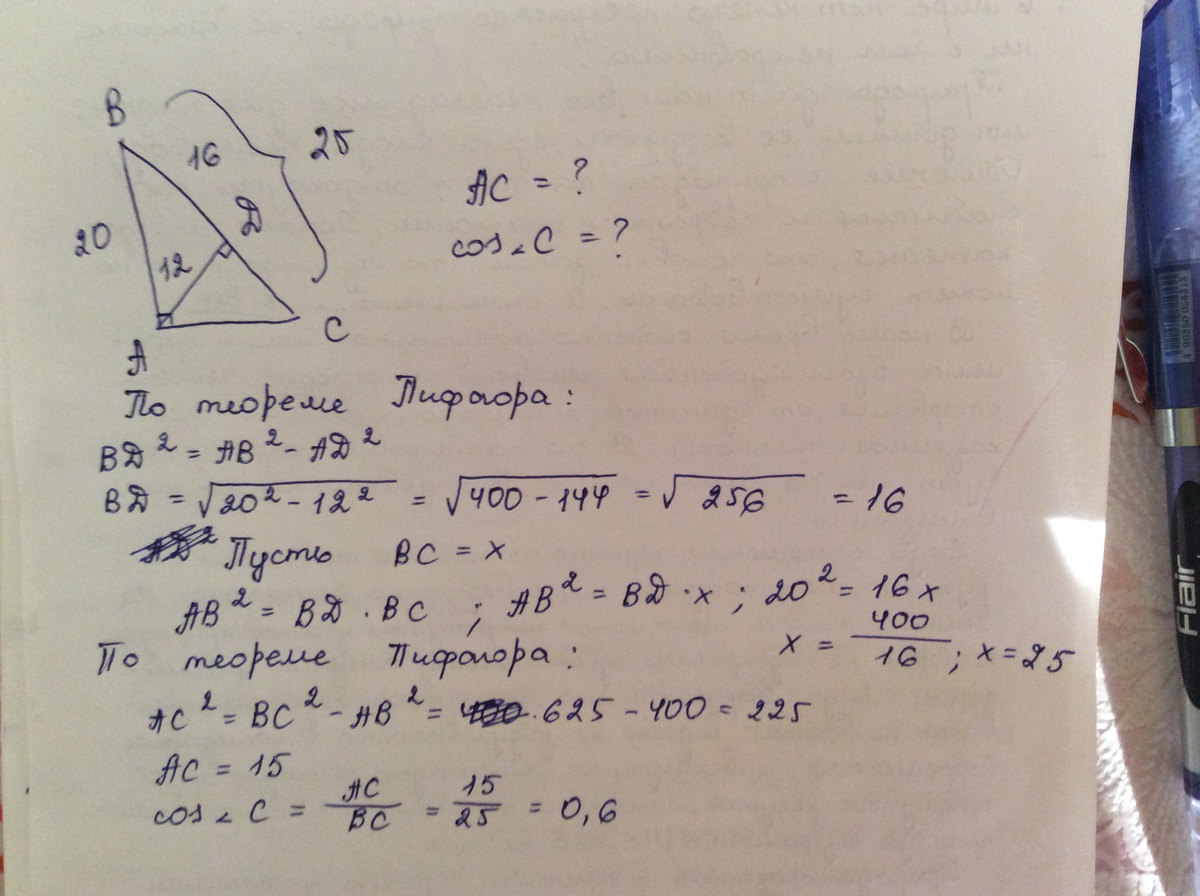 В прямоугольном треугольнике АВС угол A – прямой, AB=20 см, высота AD=12 см. Найти AC и cos C.
