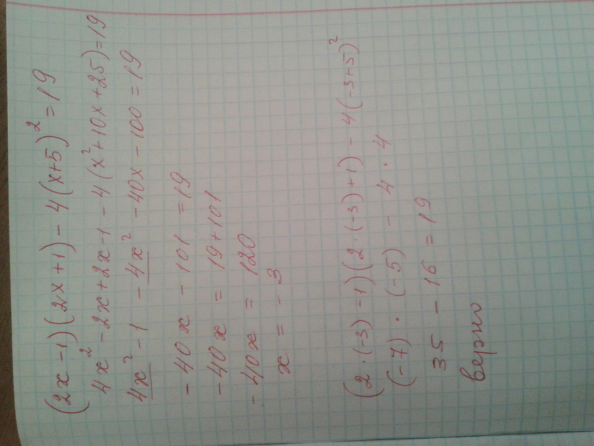 Ребят помогите пожалуйста только подробно распишите пожалуйста))))))) Решите уравнение (2x-1)(2x+1)-4(x+5)^2=19