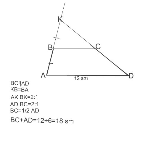 В трапеции ABCD продолжения боковых сторон пересекаются в точке К,причем точка B-середина АК. Найти сумму оснований трапеции,если AD=12см