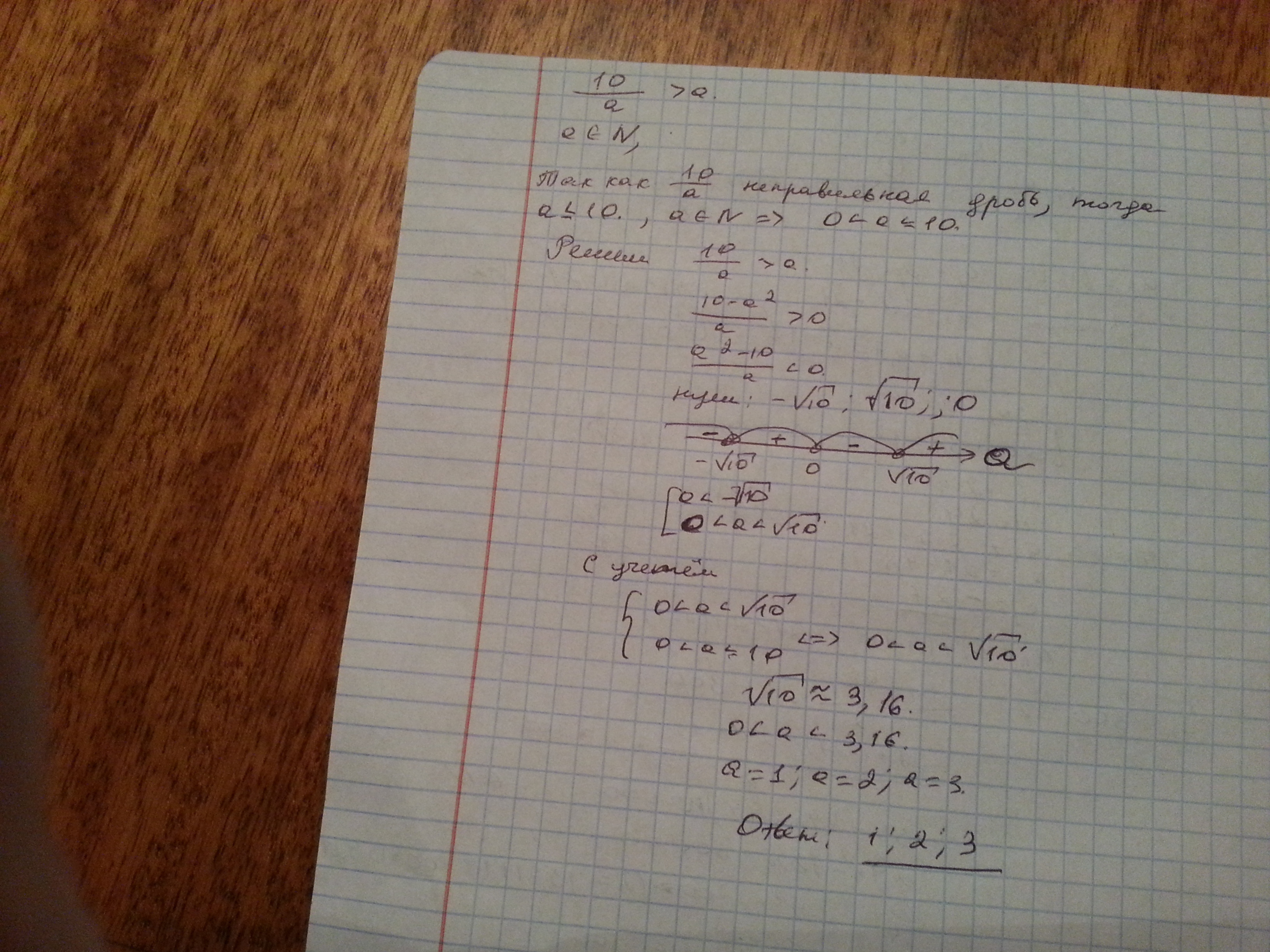 при каких натуральных значениях а является верным неравенство 10/а>а,левая часть которого- неправельная дробь? Срочноооооооо!!!!!
