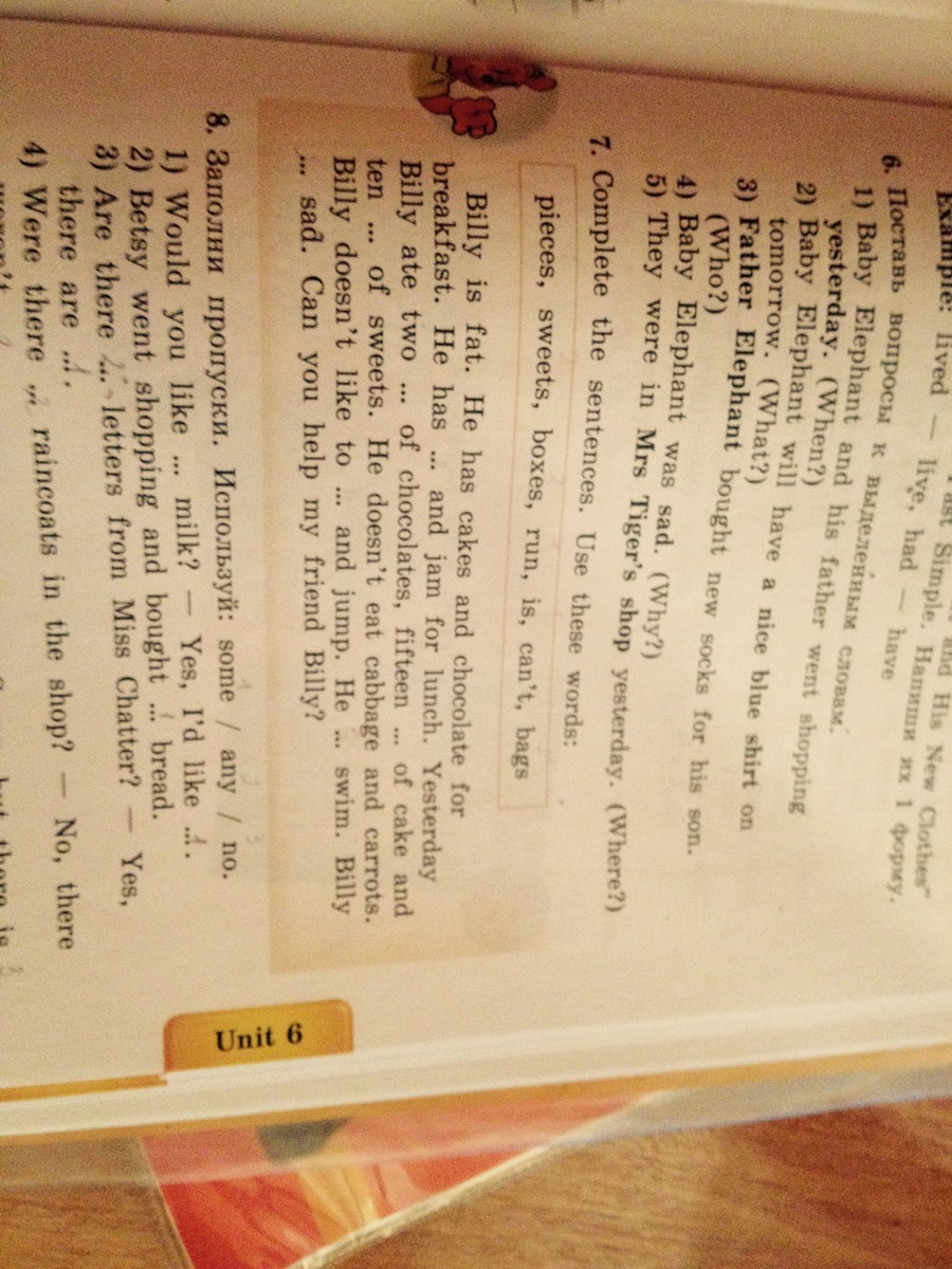 Billy is fat. He has cakes and chocolate for breakfast. He has sweets and jam for lunch. Yesterday Billy ate two bags of chocolates, fifthteen pieces of cake and ten boxes of sweets. He doesn't eat cabbage and carrots. Billy doesn't like to run and jump. He can't swim Billy is sad.