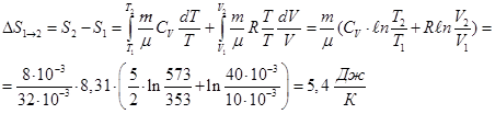 Вычислить приращение энтропии ΔS при переходе одного моля кислорода от объема V1 = 50 л при температуре T1 = 300 К к объему V2 = 200 л при температуре Т2 = 500 К