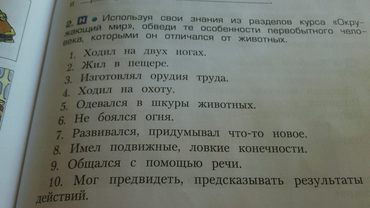 Используя свои знания из разделов курса ( Окружающий мир ), обведи те особенности первобытного человека, которыми он отличался от животных.
