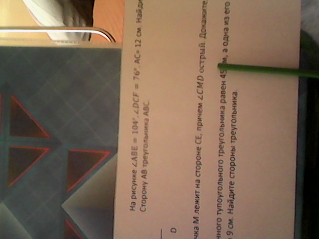 Угол АВС = 180-104=76 град Угол АСВ = углу DCF = 76 град Значит треугольник АВС - равнобедренный АВ=АС=12 см.Ответ: 12 см. номер 1 АВ=ВС т.к. треугольник АВС равнобедренный с основанием АСР= АВ + ВС +АС=45Пусть х см сторона АС(х+9) см сторона ВС(х+9) см сторона АВт.к перемитр равен 45 см, тогда составим уравнение:х+2*(х+9)=45х+2х+18=453х=27х=99 см сторона АС18см=ВС=АВОтвет: 18, 18, 9. номер 3 В треугольнике DME: угол DME - тупой (смежный с острым), значит, угол DEM - острый (двух тупых в тр-ке не может быть). А против большего угла в тр-ке лежит большая сторона, т.е. DE>DM номер 2