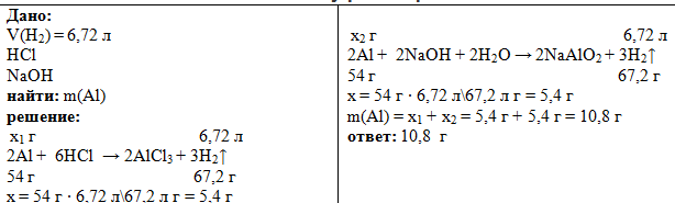 при растворении алюминия в соляной кислоте и в щелочи выделился газ обьемом 6.72 л. вычислить массу растворившегося алюминия
