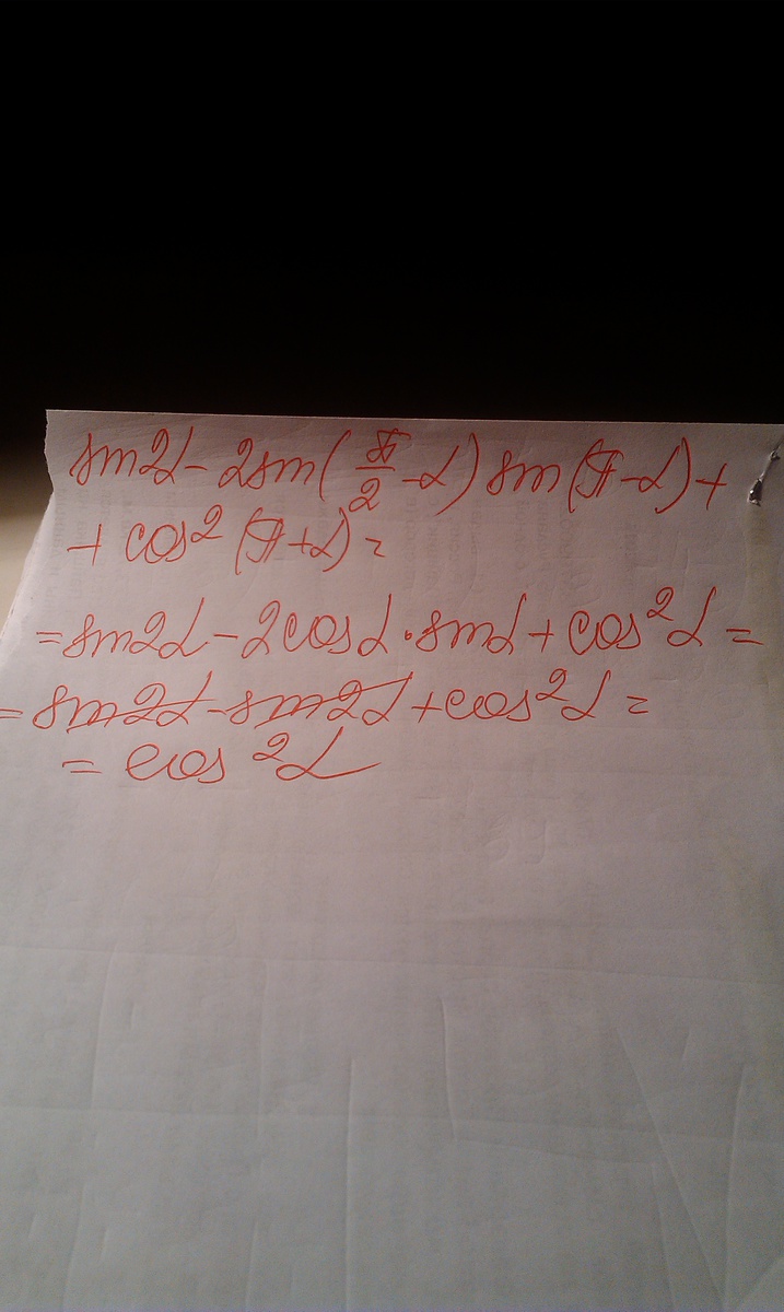 помогите пожалуйста!!! упростить выражение sin (2альфа) - 2sin(П/2-альфа)* sin(П-альфа)+ cos^2(альфа+П)